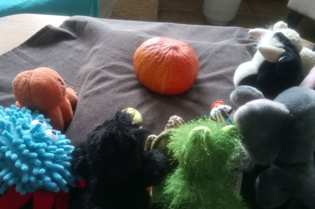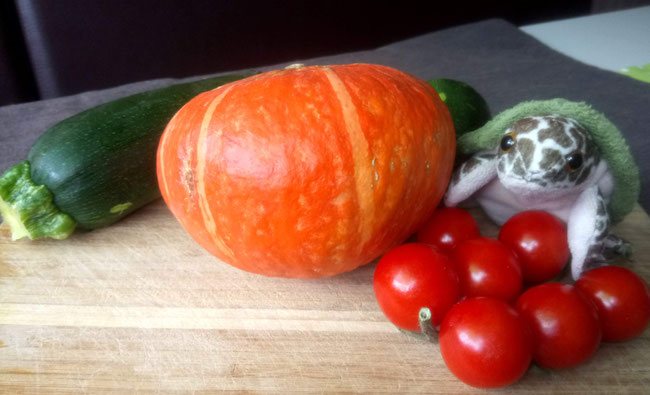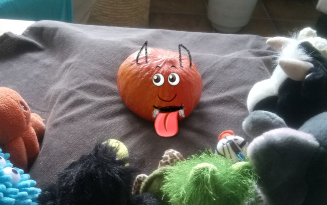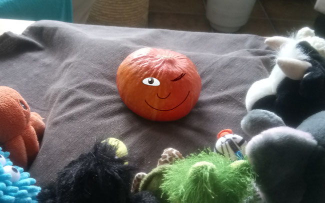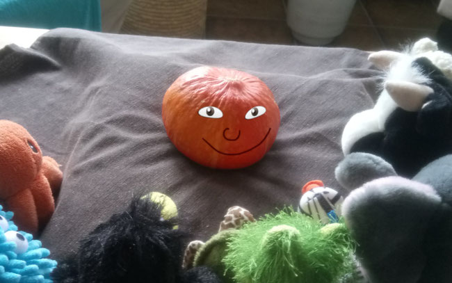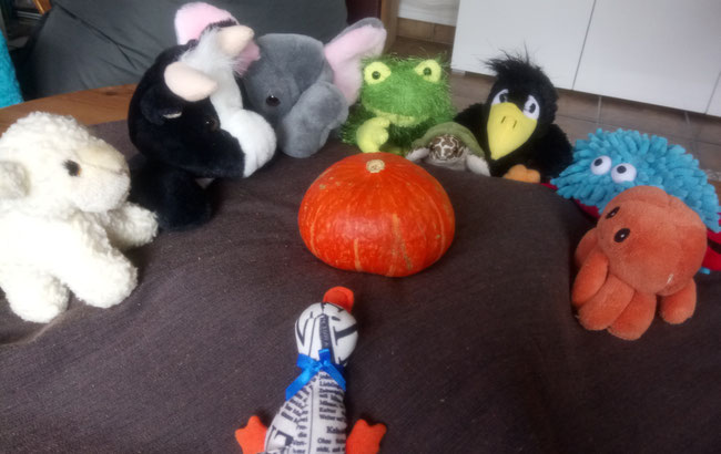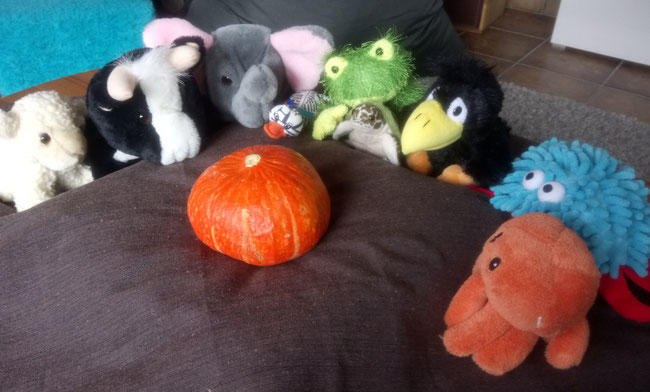Habt ihr meinen schönen orangenen Kürbis gesehen? Ich habe mir so viel Mühe gegeben, ihn in die Küche zu rollen, aber nun ist er weg! Auch die Anderen - Froschi, Toni, Paula, Elli, Gundi, Qualli und Azzurro kann ich nicht finden.