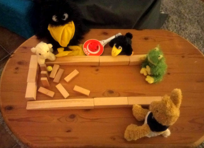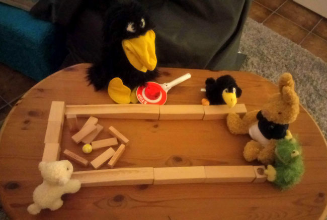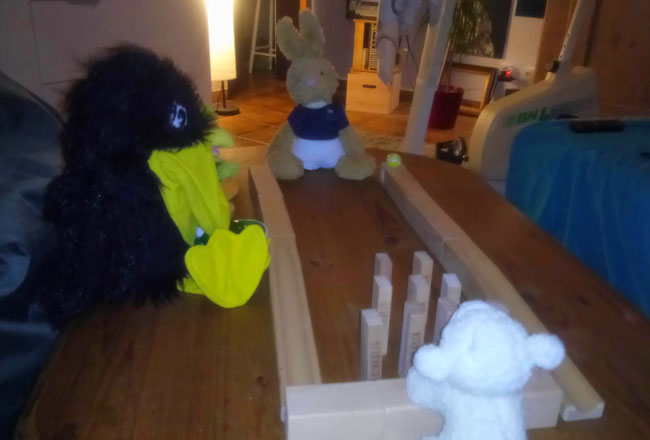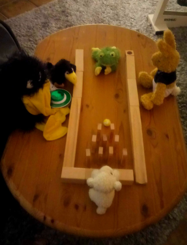 Seit gestern, dem 22. September, ist es laut Kalender Herbst bei uns. Abends wird es immer früher dunkel. Wir haben deshalb heute beschlossen, noch drinnen zu kegeln. Unsere Kegelbahn haben wir gerade selbst gebaut.