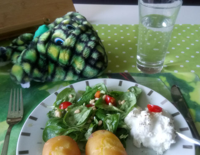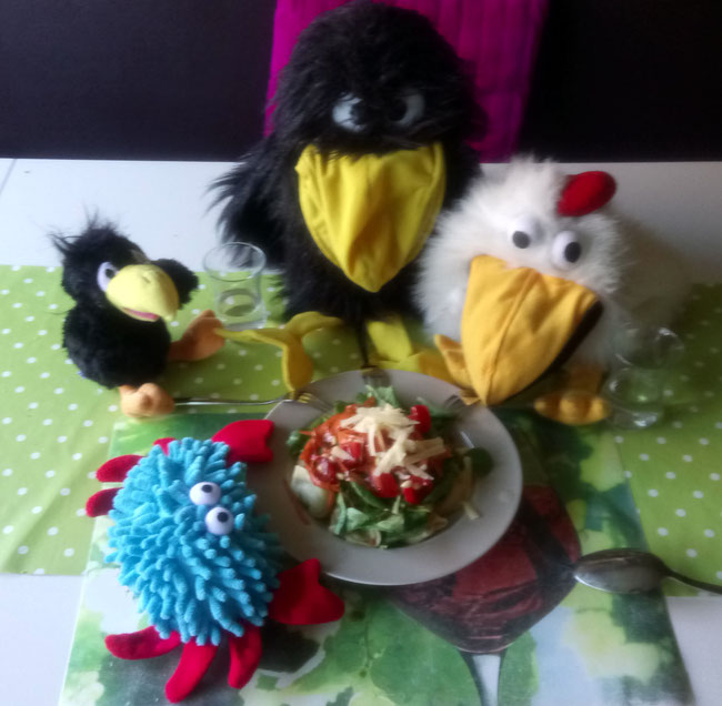 Zum Mittagessen habe ich heute Tortellini-Salat für uns gemacht. Azzurro war erst etwas erschrocken, weil ihn die Form der Tortellinis an kleine Krebschen erinnerte. Dann mussten wir ihm erklären, dass es nur harmlose, mit Spinat und Käse gefüllte Nudeltaschen sind. Inzwischen ist er ganz begeistert von den leckeren Teigtaschen und richtig stolz, dass er mit seinen Scheren genauso elegant essen kann, wie wir mit unseren Gabeln. Azzurro hat eben sein ganz eigenes Essbesteck.