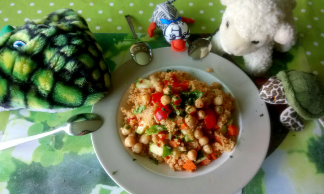 Seht mal Kinder, gestern abend gab es Couscous-Salat. Schön bunt, nicht wahr? Wir hatten wenig Zeit, aber er war ganz schnell gemacht und macht uns auch alle gut satt wegen der Kichererbsen. Irgendjemand hat behauptet, ich hätte keinen Hunger. Aber ihr glaubt doch wohl nicht, dass ich wegen so ein paar Quadratmetern Wiesenklee auf ODILOs leckeres Abendessen verzichte ... hicks! Vielleicht esse ich sogar noch ein Meisenbällchen zum Nachtisch oder ein paar knallige Kapuzinerchen ... hicks!