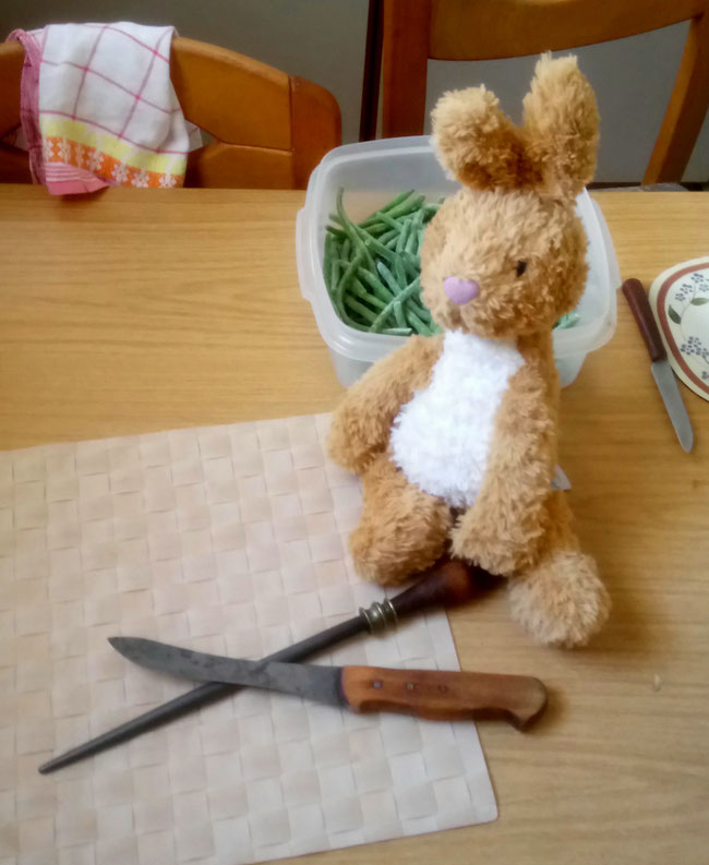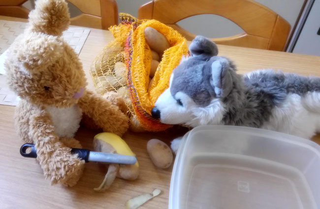 Wir dürfen aber trotzdem beim Kartoffelschälen helfen, denn dafür hat sie einen besonderen Schäler, an dem wir uns kaum verletzen können. Seht mal:
