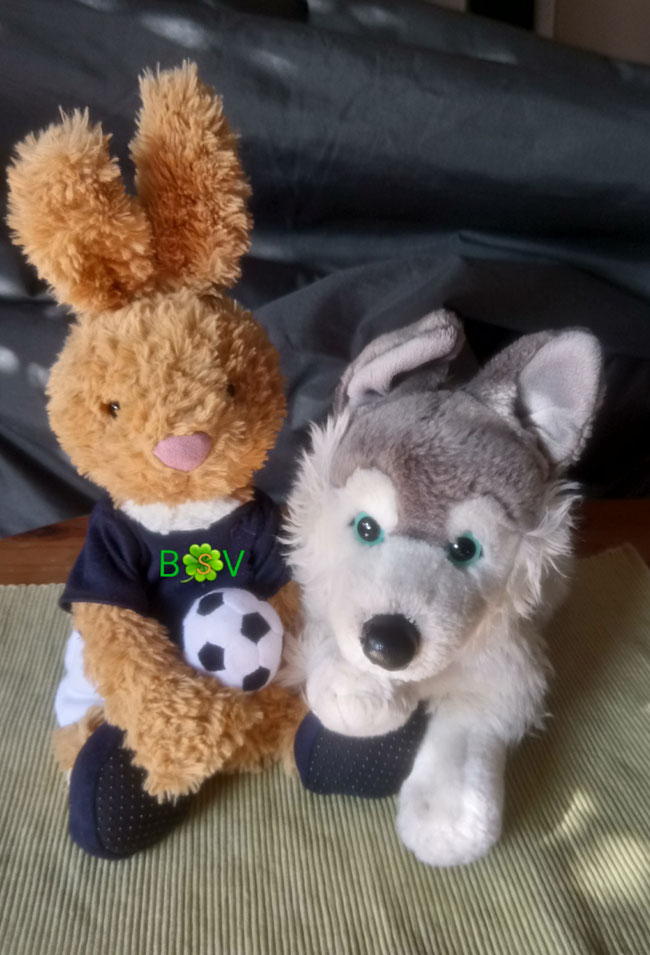 Hanno und ich wir gehen jetzt zweimal in der Woche Fußball spielen. Unser Sportverein, der "BSV Wiese, Feld und Wald" besteht zur Zeit aus Hunden, Füchsen, Hasen und Kaninchen. Bald kämpfen wir mit unserer Mannschaft, den "Torjägern" gegen die "Windhunde". Dafür müssen wir erst einmal fleißig trainieren. Hannos Arm ist wieder kräftig geworden, denn Hanno hat sehr viel Möhrengymnastik gemacht. Er darf wieder auf allen Vieren rennen, so schnell er kann, ganz hoch springen und auch Bälle fangen. Endlich können wir uns wieder frei zusammen bewegen. Du siehst ganz toll aus mit deinem Trikot, Hanno! Auf geht's zum Training, schießen wir los!