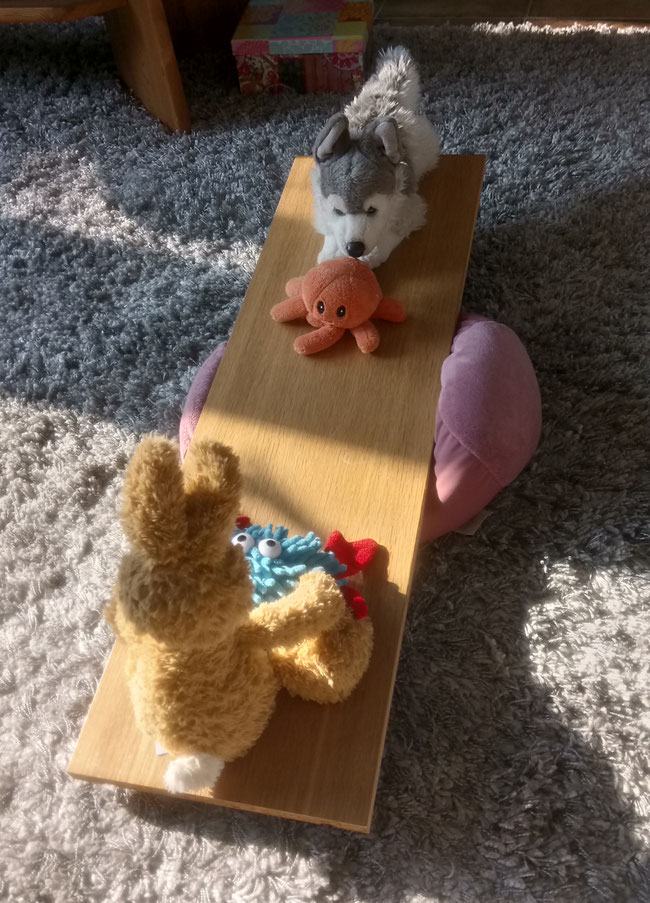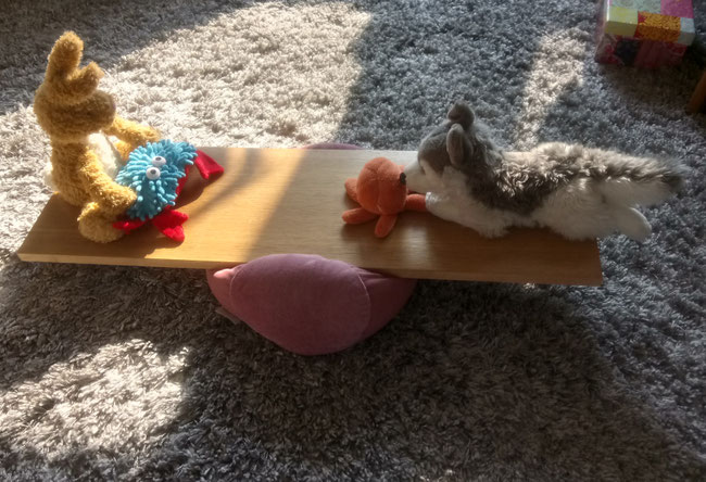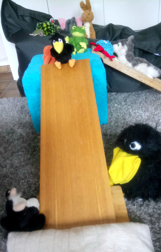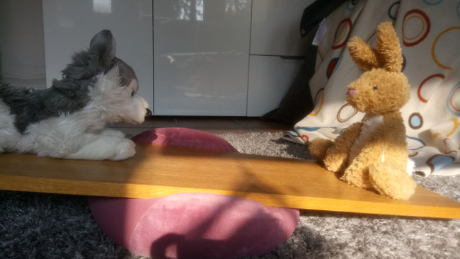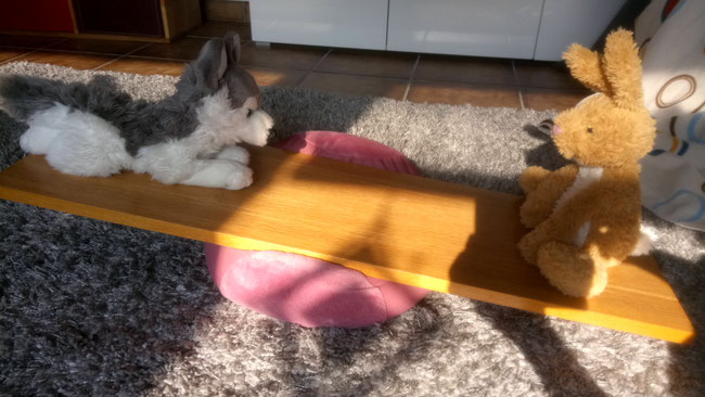 Weil Layka schwerer als ich ist, hat sie sich etwas weiter zur Mitte des Brettes hin gelegt, dann kann auch ich auf dem Boden anstoßen.