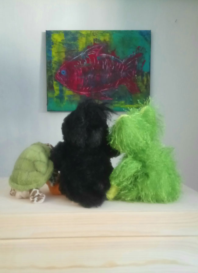 Der rote Fisch erinnert mich an unseren Teich. Dort haben wir auch rote Fische. Sie lassen sich durch nichts aus der Ruhe bringen und ziehen immer weiter ihre Runden im Wasser - selbst dann, wenn wir alle gleichzeitig hinein springen.