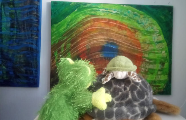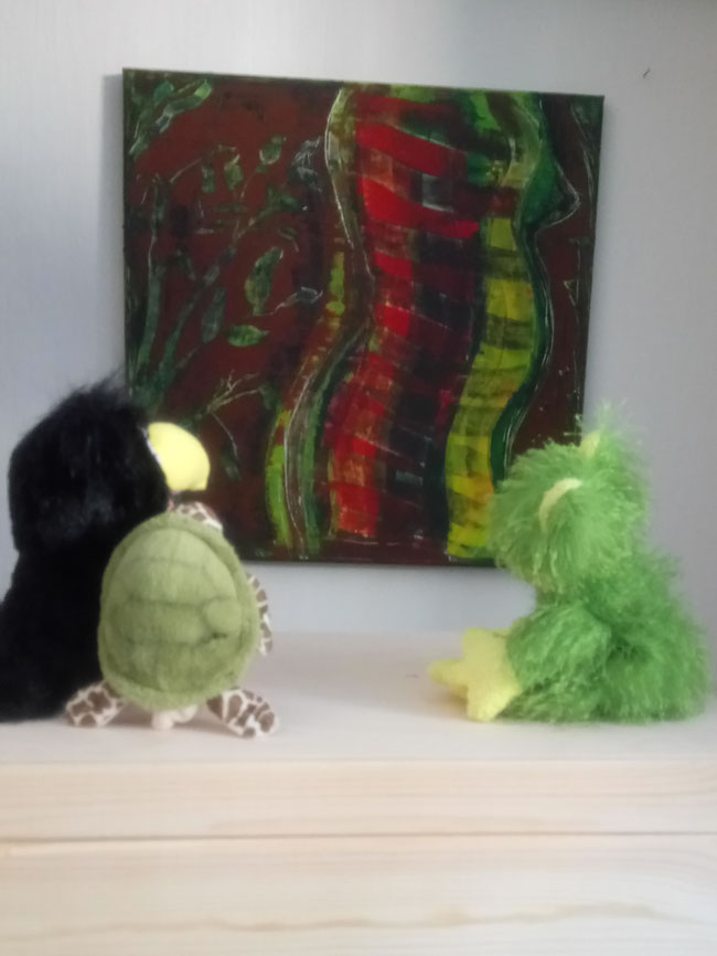 TONI und FROSCHI bewundern das bunte Gemälde vom Bauch einer Frau, die wohl gerne heimlich Süßes geknabbert hat.