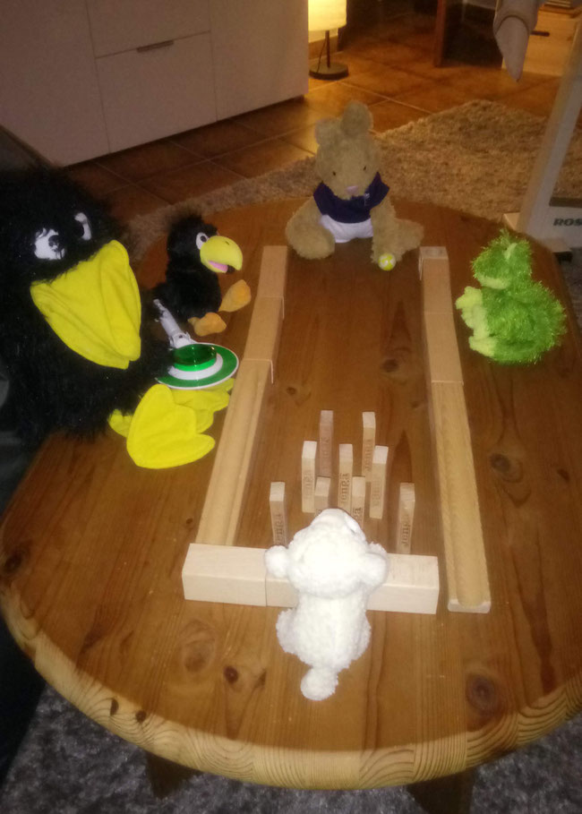 Wow, ich habe 8 Kegel niedergeschmettert! Jetzt ist Froschi an der Reihe.